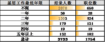 本次招录要求有基层工作经验的职位共1104个,占总职位数的63%,与去年相比下降了3%;共招录1663人,占总招录人数的45%,与去年相比上升了3%。同时有近四成招录职位不限工作年限。这与公务员考试的总体趋势是相吻合的。