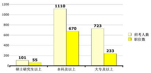 从本次招录的专业来分析,本科及以上学历人群占优势,有670个职位要求考生为本科及以上学历,占总招录职位数的70%,共招录1110人,占总招录人数的57%。起点为大专学历的职位有233个,共招录723人。另外,还有55个职位要求考生为研究生以上学历,其中,海南省考试局的命题管理岗位主任或副主任科员一职面向全国招录一名应届硕士毕业生,要求专业为教育经济与管理(教育考试管理方向),同时还要求该岗位人员具有两年以上基层工作经历,门槛较高。