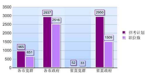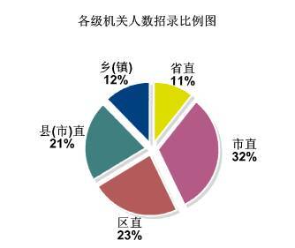 总体来看,本次招录人数与职位数集中在政府系统,省直与各市政府共招录5887人,比例达85%;党群机关共招录1017人,比例占15%。从各层级来看,市直、区直招录人数占到一半多,市直最多,招录人数达32%。