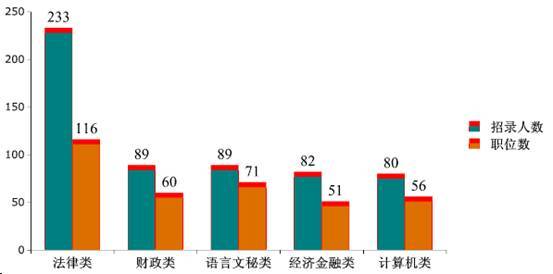 本次招考有362个职位不限专业,占总招录职位数的46%,共招录406人,占总招录人数的40%。中公教育专家对比了去年的数据,去年有47%的职位没有专业限制,招录人数占总数的49%,总体来看,今年对专业的限制稍有提升。法律类、财政类、语言文秘类等专业为本次招录最受青睐的专业。