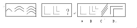 解答:正确答案为B。因为只有B能使两套图形具有相似性,仅仅元素不同,一个是实的曲线,一个是虚的直线,但两组图形中元素的排列规律完全相同。 备考策略:解答此类试题时,首先要对第一套图形中的三个图形进行两两比较,发现它们之间的共同点和差异,尤其要注意第三个图形与第二个图形的差异。因为这种差异与你要找的问号处的图形与第二套图形中第二个图形间的差异有比较直接的关系。然后再比较第一套图形与第二套图形在“形”上的差异。用第一套图形的变化规律和第二套图形的“形”的组合就是问号处所需的图形。图形推理中所用的图形主要是点、线、面及其组合。