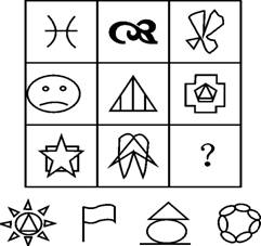 解析:样式类。这个题目比较有新意。一般样式类的题目,都是三个图形一组,分成两组,一组是题干,一组是选项。而这个题目直接将两组图形融合成一个整体。万变不离其宗,这个题目运用的是递推数列的推理思路。就是前面的两个图形进行去同存异得到第三个图形。以此规律,故正确答案选择A。