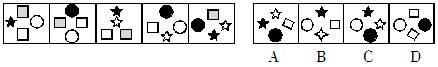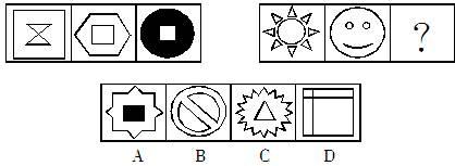 每个图形总数量的恒定,前五个图出现的六种图形的数量分别为黑方块四个、白方块四个、黑星星三个、白星星三个、黑圆三个、白圆三个,照此思维,第六图应为黑星星、白星星、黑圆、白圆各一个,对照选项,C项符合,可得题解。