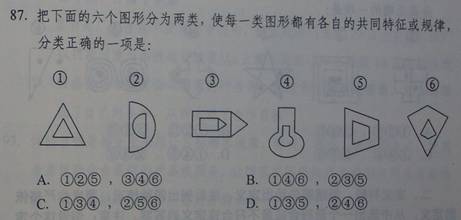这是一道新题型,很多同学看到后惊慌失措,不知从何下手。其实新题型对那些坚持按照图形属性来复习的同学来说并不难,考查的还是图形的三大内在属性中的对称性。题干中的图形都是对称图形,有的图形是竖着的对称轴,有的图形是横着的对称轴,根据对称轴方向,①④⑥都是竖着的对称轴,②③⑤都是横着的对称轴。所以选择B选项。