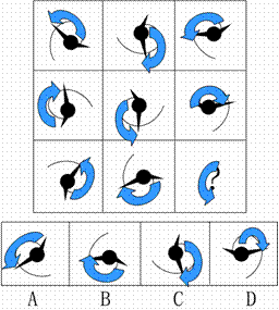 确定规律:第一行图形第一个与第二个图形时针方向相反因此为翻转的过程;而第一个和第三个图形时针方向相同因此为旋转的过程;这样第三行第三个图形的时针方向同第一个图形一致即可