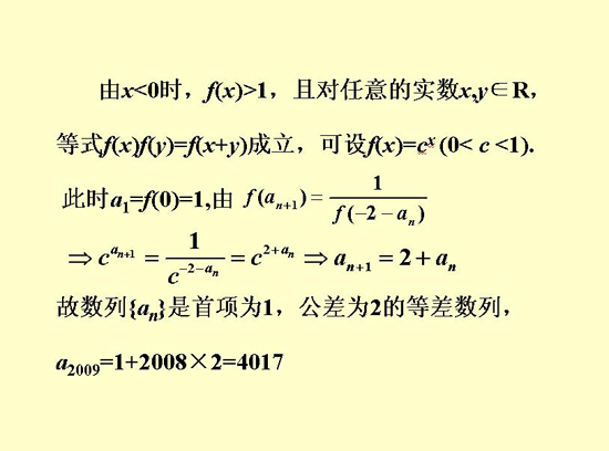 刚才的题是问2008,这道题是问2009。问我们刚才研究的策略是不是在这个题目中依然有效。先考虑一下。这道题前面给的函数从它的叙述大家发现没发现实际上它是一个什么函数呢?注意,这是一个选择题,我们可以设定一个符合题意的特殊函数来简化后续的计算。自变量相加、函数值相乘就可以很快地确认是一个指数函数。而且它是一个减函数,这个底数的取值范围是在0到1之间。有了这样的关系以后,我们在代入到后面的递推关系式里面,一做简化大家会发现这实际上是一个等差数列。