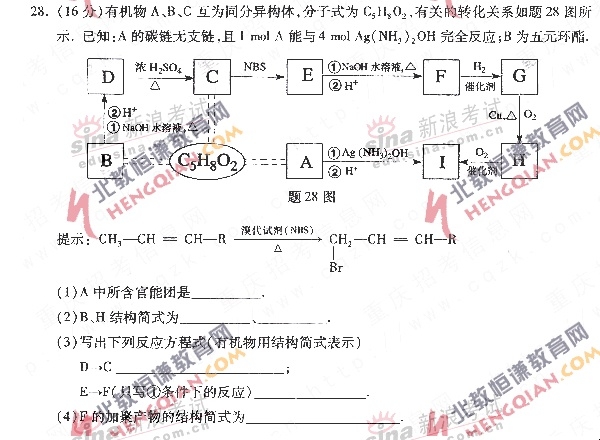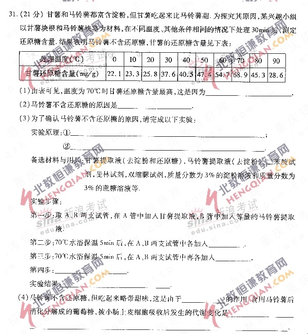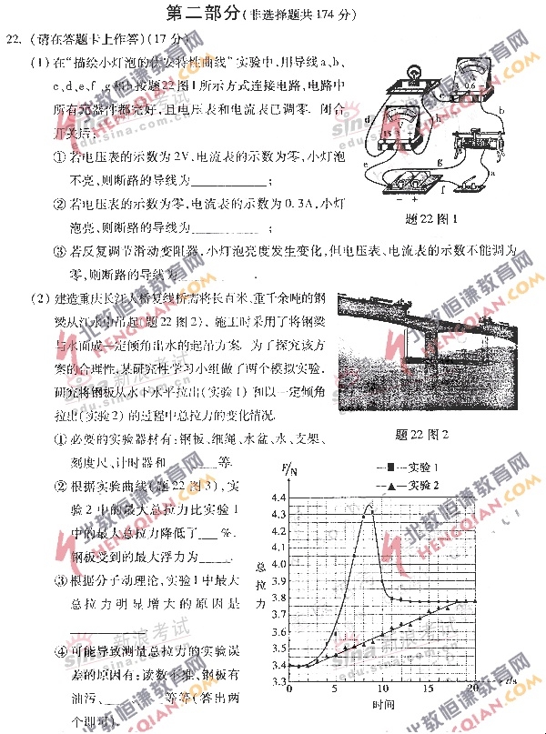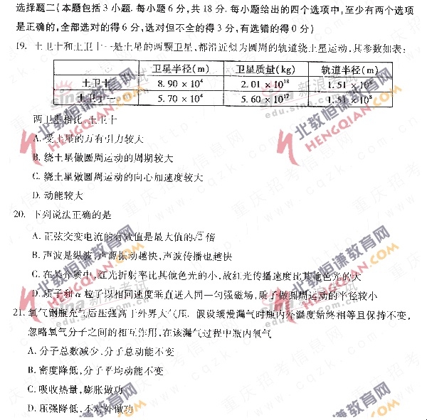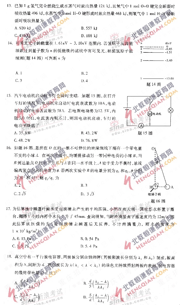 2007年高等学校全国统一考试理综试题(重庆卷)
