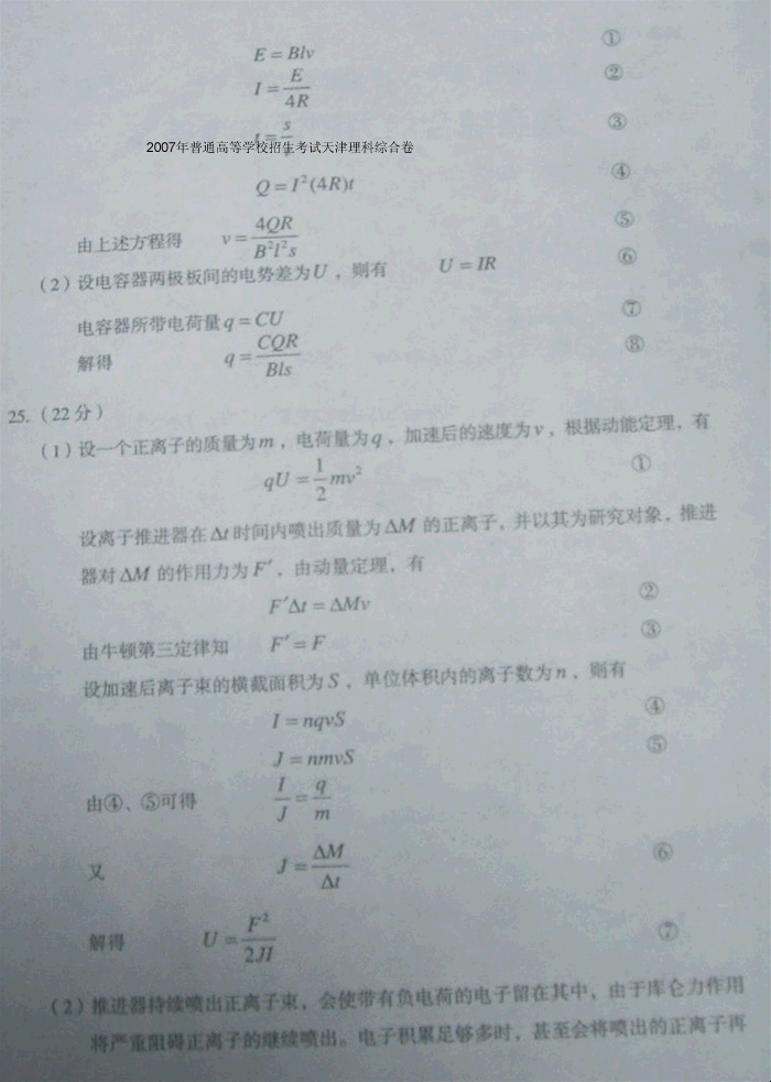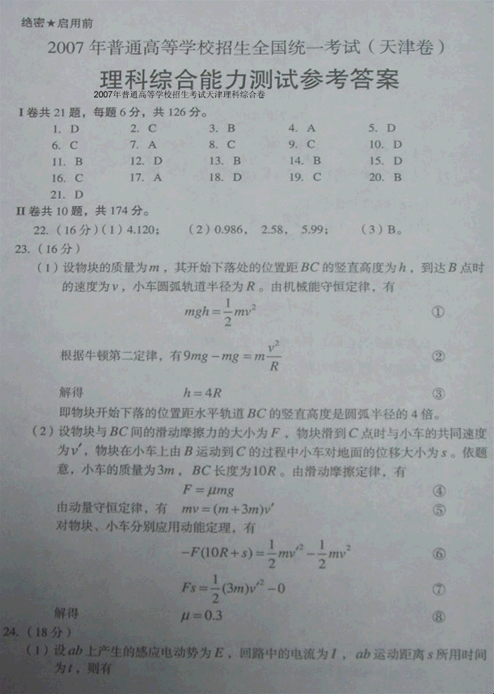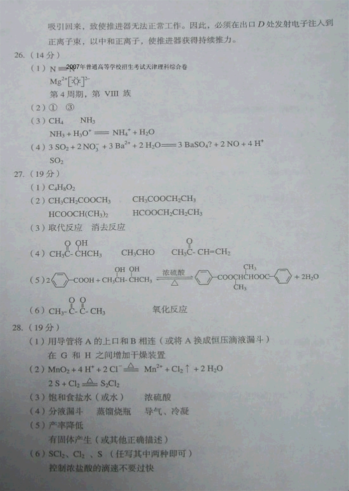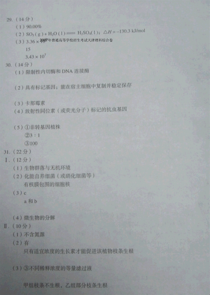 2007年普通高等学校招生考试天津理科综合卷