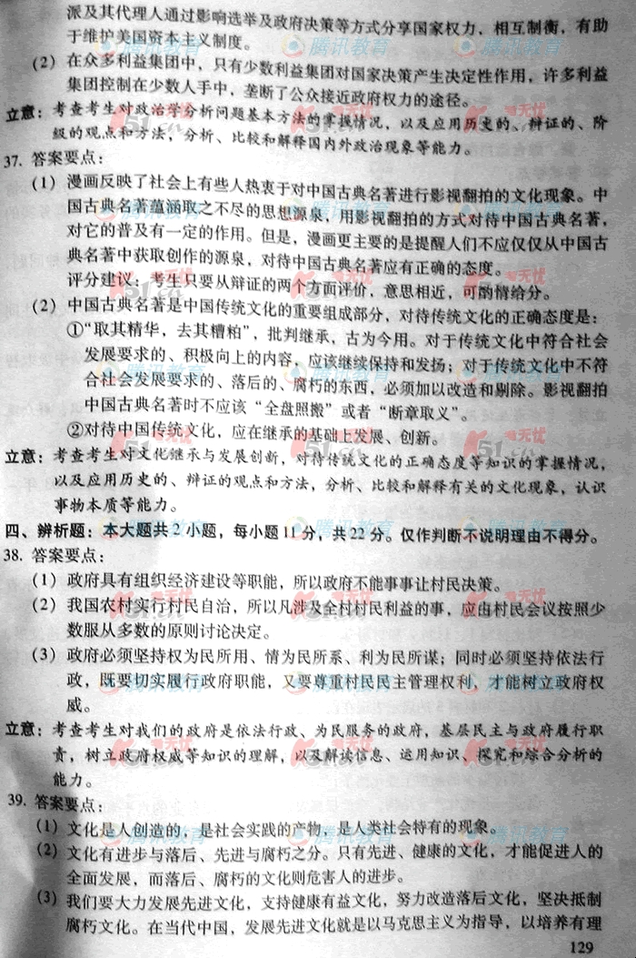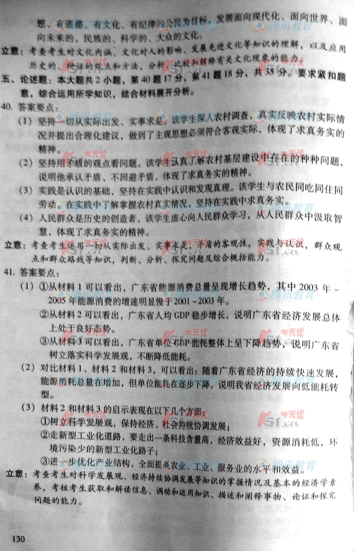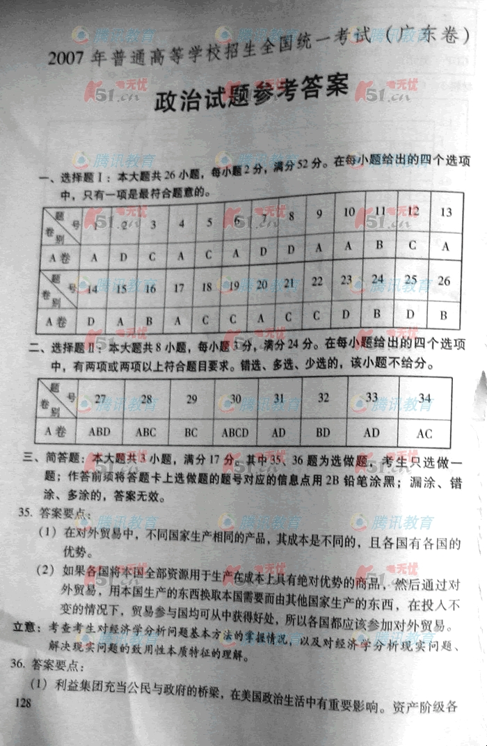 2007年普通高等学校招生考试广东政治卷答案